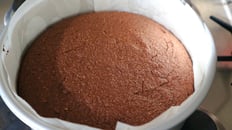 Add the ground almonds, 50g of cocoa powder, and 1/8 teaspoon of salt. Blend again.