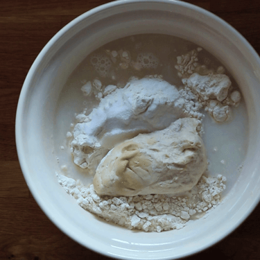 In a jug or bowl, combine the sourdough starter, 100g of flour, and 60ml of water to make a thick dough.