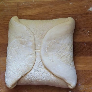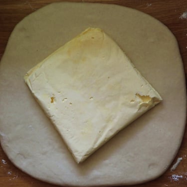 Place the butter block in the centre at a 45-degree angle. Fold the dough corners over the butter to encase it completely.