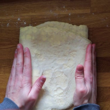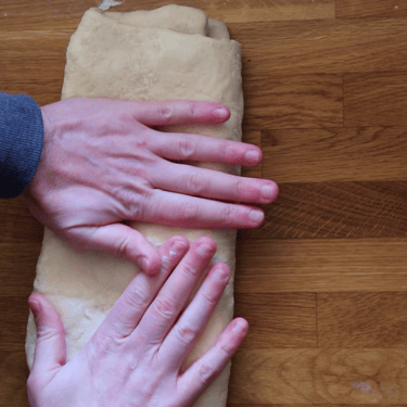 Roll the dough into a 50-60cm length. Perform a book fold: fold the bottom up past halfway, fold the top down to meet it, then fold the dough in half.