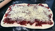 Spread the second rectangle with the tomato paste and remaining cheese. Roll up tightly and seal the seam.